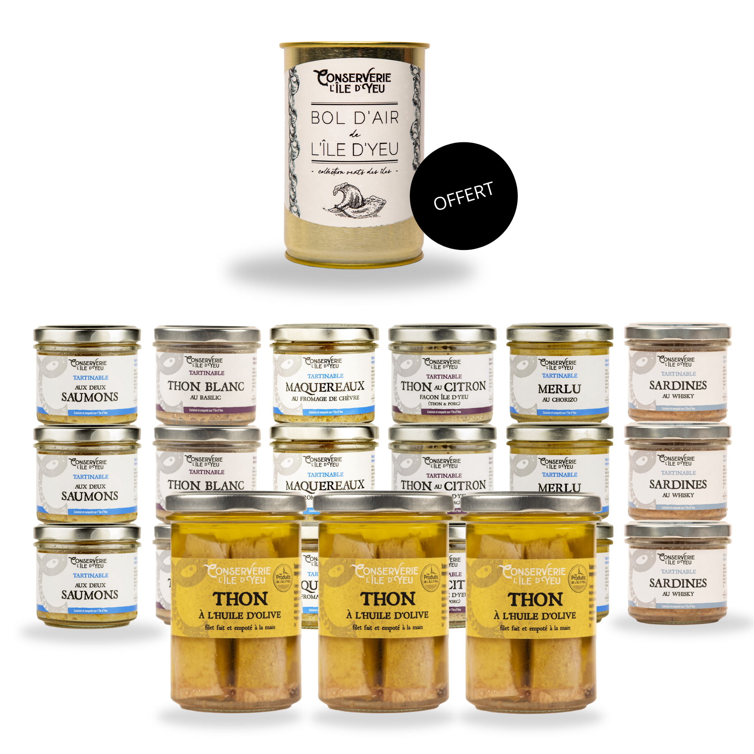 Amoureux de la mer et des conserves de poisson ? Ce coffret cadeau Fan absolu, la mer gravée dans le sang est pour vous ! Retrouvez le meilleur de la conserverie de l’île d’Yeu avec un lot de tartinables de poisson : tartinables de thon blanc au basilic, tartinables de thon blanc au citron, tartinables de maquereaux chèvre, tartinables au deux saumons, tartinables merlu chorizo, tartinables de sardines au whisky, thon germon à l’huile et pour couronner le tout un grand bol d’air de l’île d’Yeu. Plus d’excuse, vous connaîtrez les délices de l’île d’Yeu sous toutes ses saveurs.