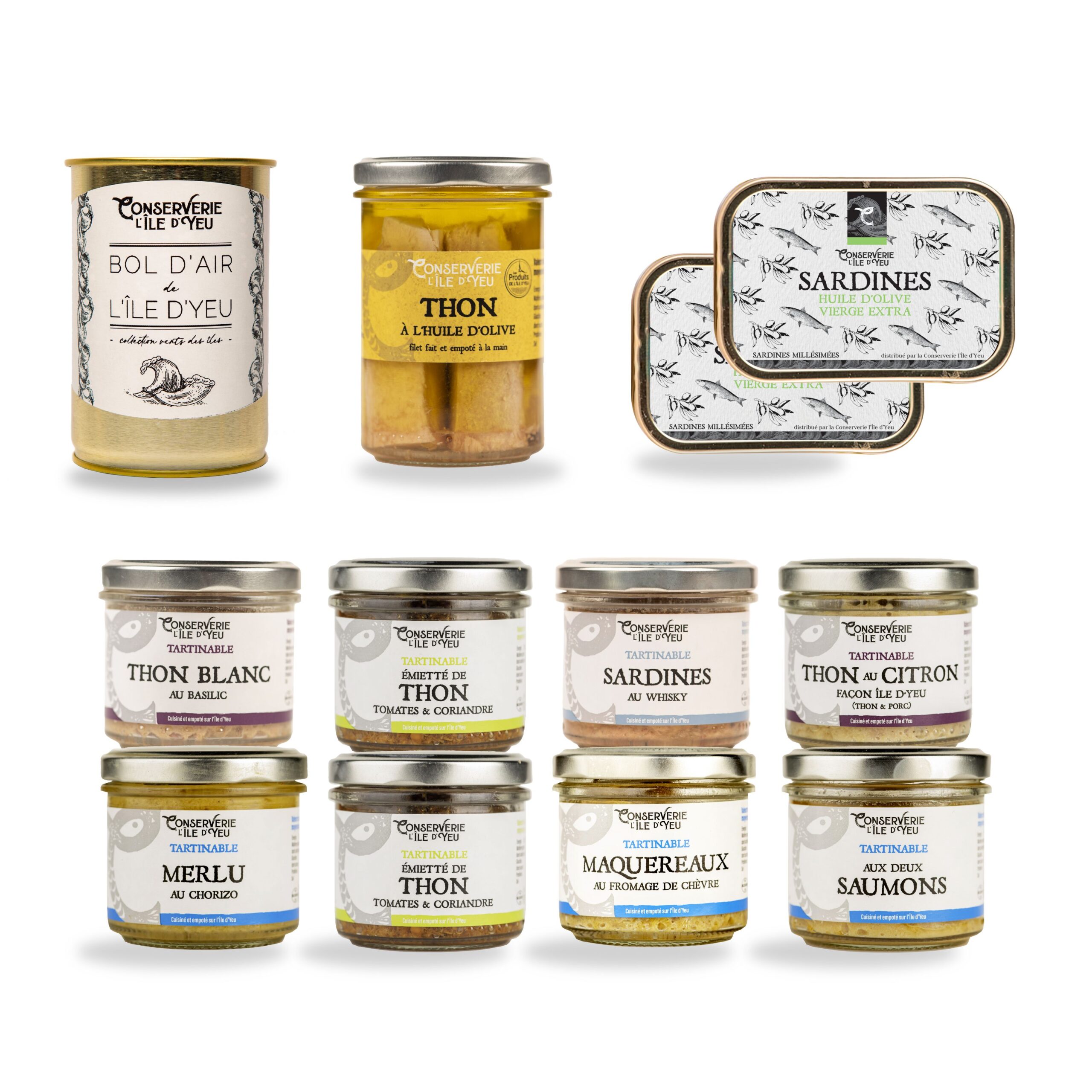 En panne d’idée pour vos apéros ? Ce kit « starter apéro » vous donne l’essentiel pour régaler vos convives : des sardines en boîtes, du thon blanc germon, une sélection de tartinables : tartinable de thon blanc au basilic, maquereaux chèvre, merlu chorizo, thon blanc citron, deux saumons, sardines au whisky, des émiettés de thon tomates coriandre, un thon blanc germon à l’huile d’olive, et en prime le couteau tartineur. Tout est prêt ! Transportez vous sur l’île d’Yeu le temps d’un apéro et respirez le bon bol d’air directement capturé sur l’île d’Yeu.